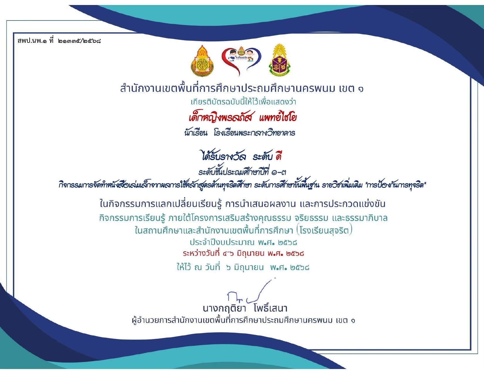 2568 เด็กหญิงพรลภัส แพทย์ไชโย ได้รับรางวัล ระดับ ดี กิจกรรมการจัดทำหนังสือเล่มเล็กจากผลการใช้หลักสูตรต้านทุจริต ระดับการศึกษาขั้นพื้นฐาน รายวิชาเพิ่มเติม “การป้องกันการทุจริต” สำนักงานเขตพื้นที่การศึกษาประถมศึกษานครพนม เขต 1 06 มิถุนายน 2568
